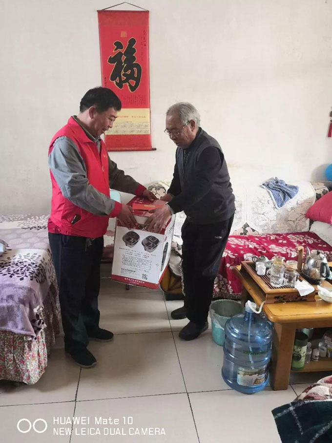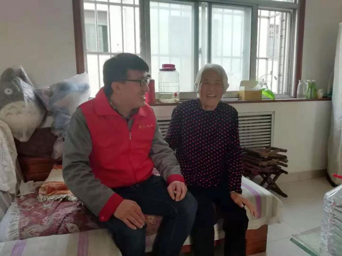 義工趕赴員工家中送去祝福,并與老人合影留念